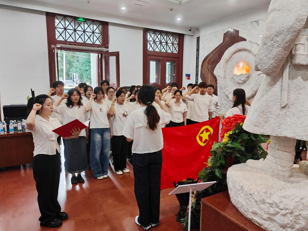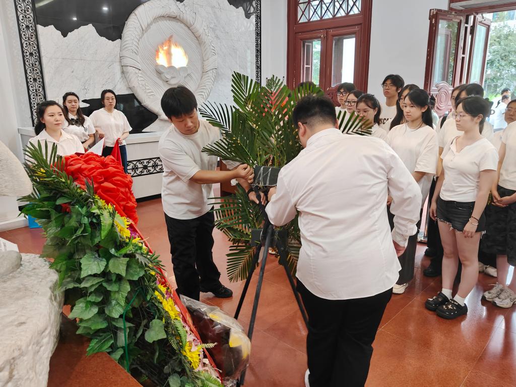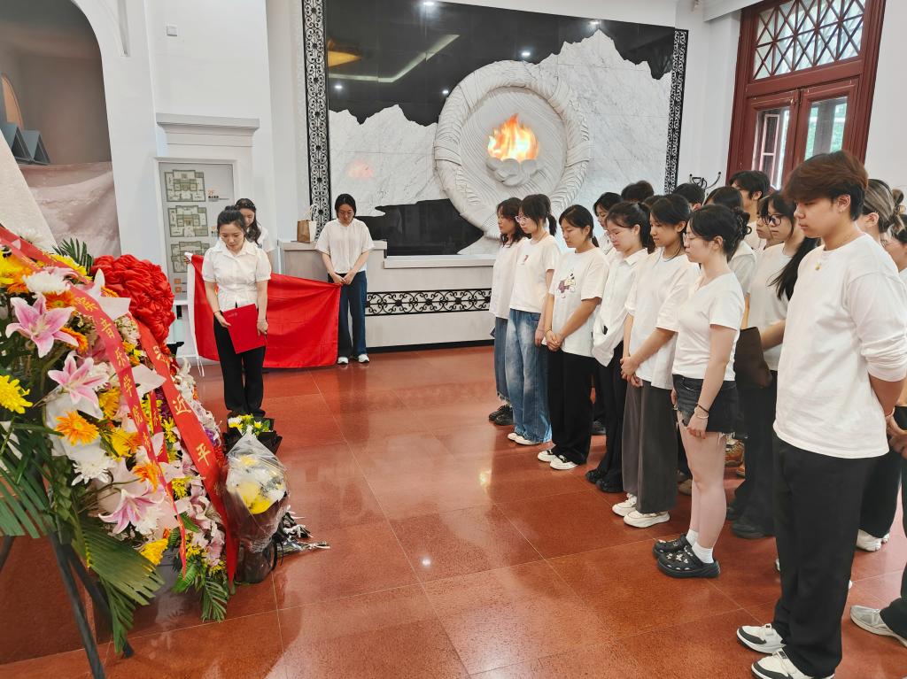当天下午,青马班学员统一着装、整队肃立,于纪念馆前举行献花仪式。仪式在庄重氛围中开始,两位学员代表缓步上前,敬献花篮,寄托对先烈无尽的怀念与敬仰。随后,全场肃立,默哀一分钟,静谧中饱含着对先烈的无限追思。默哀毕,旗手护送团旗缓缓前行,全体学员面向团旗举起右拳,以铿锵有力的声音重温入团誓词,表达继承先烈遗志、为共产主义事业奋斗的坚定决心。