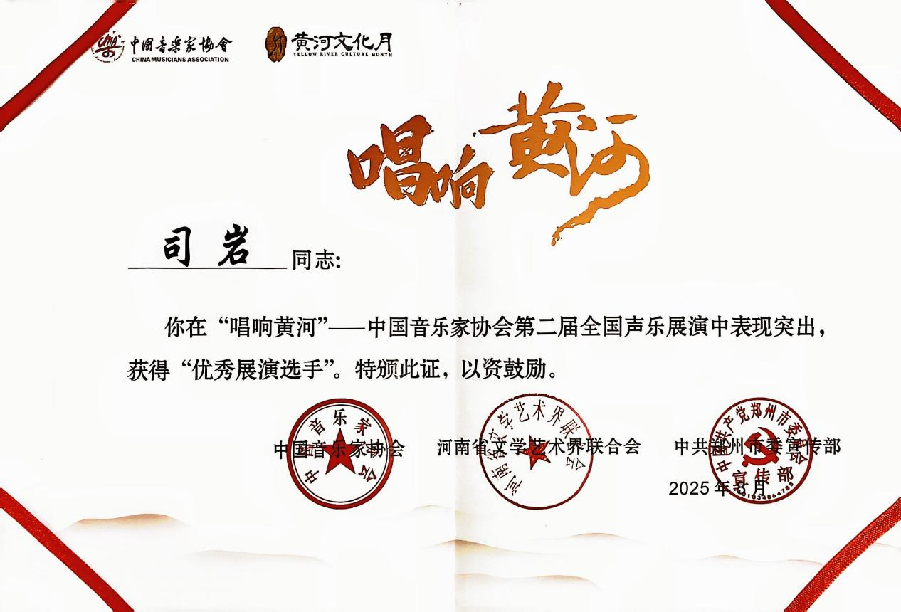 在“唱响黄河”中国音乐家协会全国声乐展演中,博士研究生司岩获评优秀展演选手。
