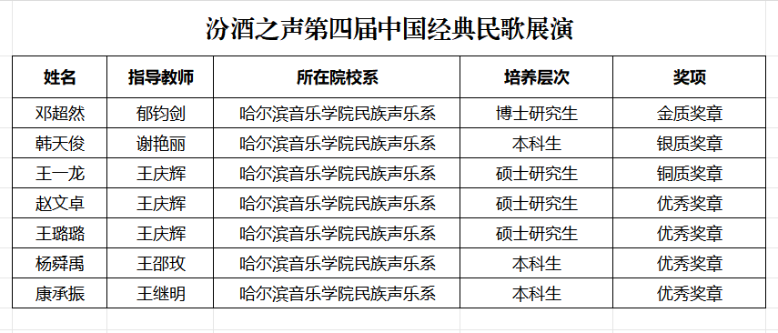 汾酒之声第四届中国经典民歌展演终选,博士邓超然获金质奖章,本科韩天俊获银质奖章,硕士王一龙获铜质奖章。研究生赵文卓、王璐璐,本科生杨舜禹、康承振获得优秀奖章。