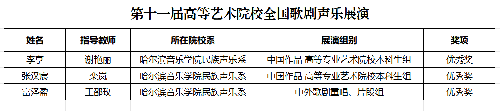 此外,在“第十一届高等艺术院校全国歌剧声乐展演”中,李享、张汉宸、富泽盈获优秀奖。