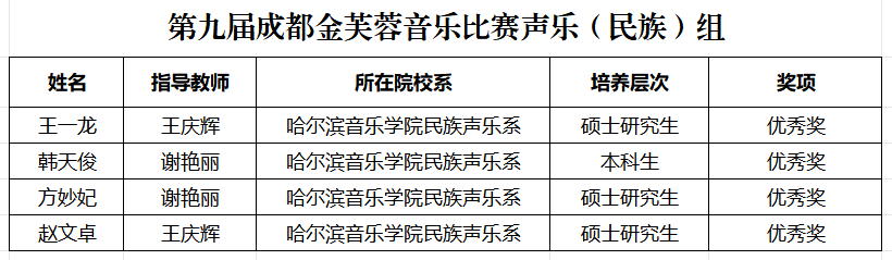 第九届成都金芙蓉音乐比赛声乐(民族)组中,研究生王一龙、方妙妃、赵文卓与本科生韩天俊同获优秀奖。