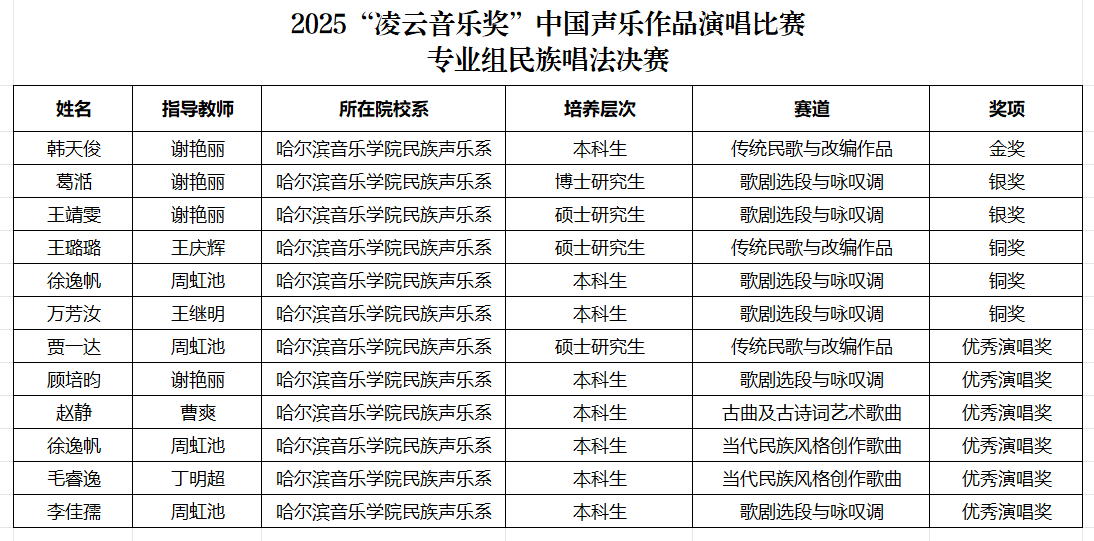 “凌云音乐奖”中国声乐作品演唱比赛决赛,韩天俊拿下传统民歌与改编作品赛道金奖,硕士王璐璐荣获铜奖;博士葛湉、硕士王靖雯获歌剧选段与咏叹调赛道银奖,本科生万芳汝、徐逸帆荣获铜奖。另有6名学子获优秀演唱奖。