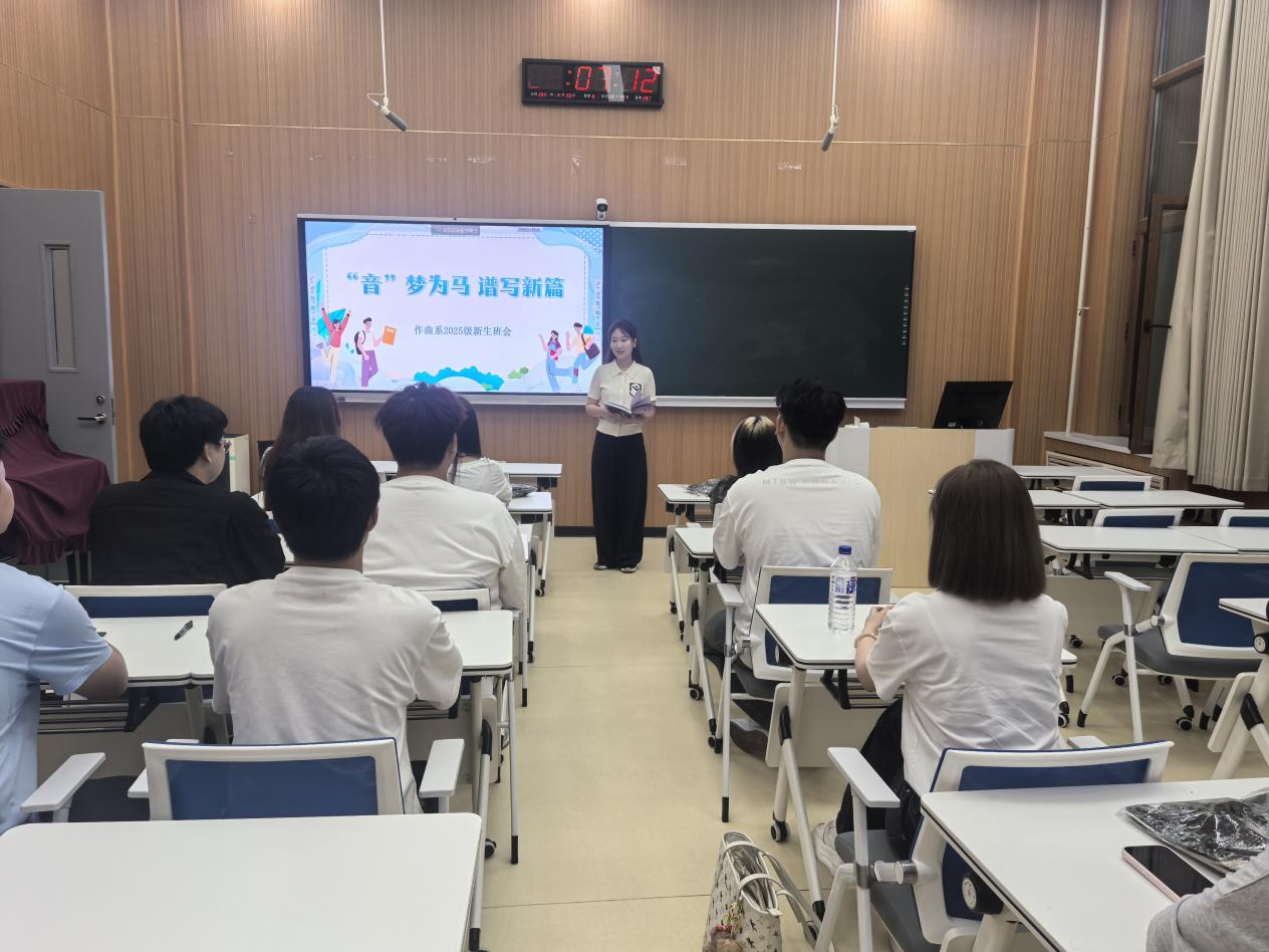 9月2日,作曲系在主楼104教室召开"音梦为马 谱写新篇"2025级新生入学主题班会。本次班会面向本硕博全体新生,由辅导员夏雨欣、马楠共同主持。班会围绕组织纪律、入学指南、环境适应、学业规划四个维度展开,旨在帮助新生尽快适应大学生活,明确学习目标,规划未来发展,为新学期各项工作的顺利开展奠定坚实基础。