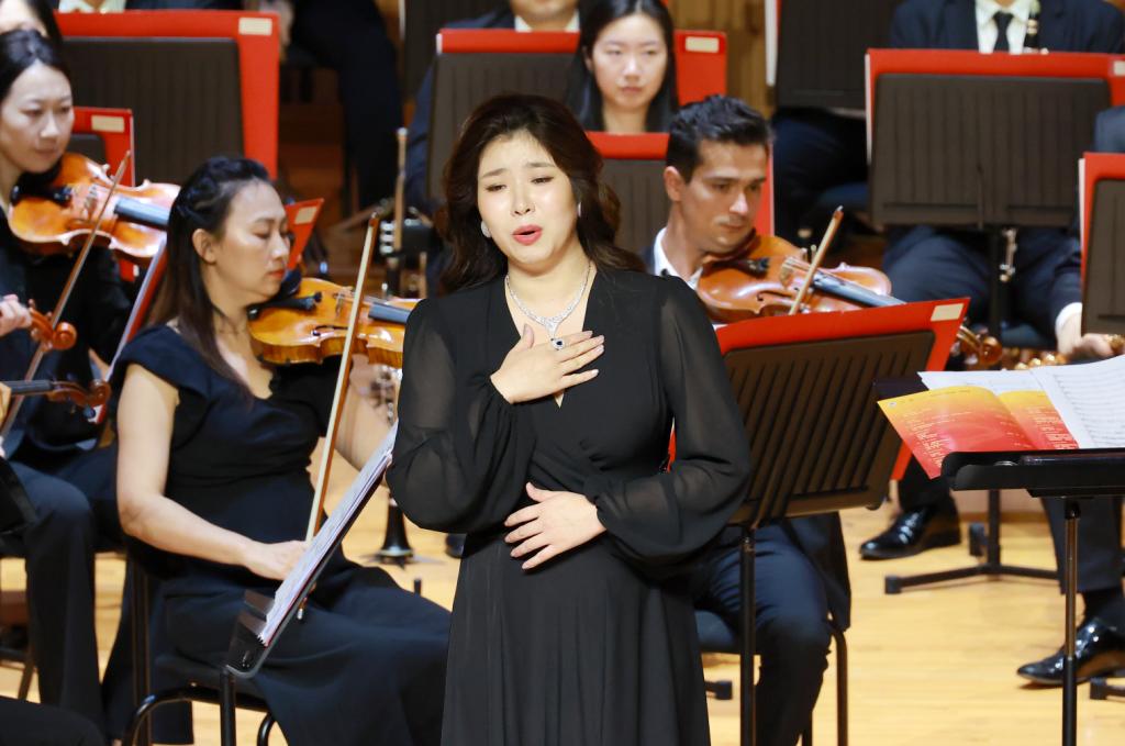 科研助理刘碧玥演奏的古筝与乐队《望秦川》气象开阔、技艺精湛,勾勒出壮美的音乐画卷;民族声乐系博士研究生郁留成献唱地方民歌《大河涨水沙浪沙》《挑茶郎从门前过》,生动质朴,尽显民歌风采韵味。