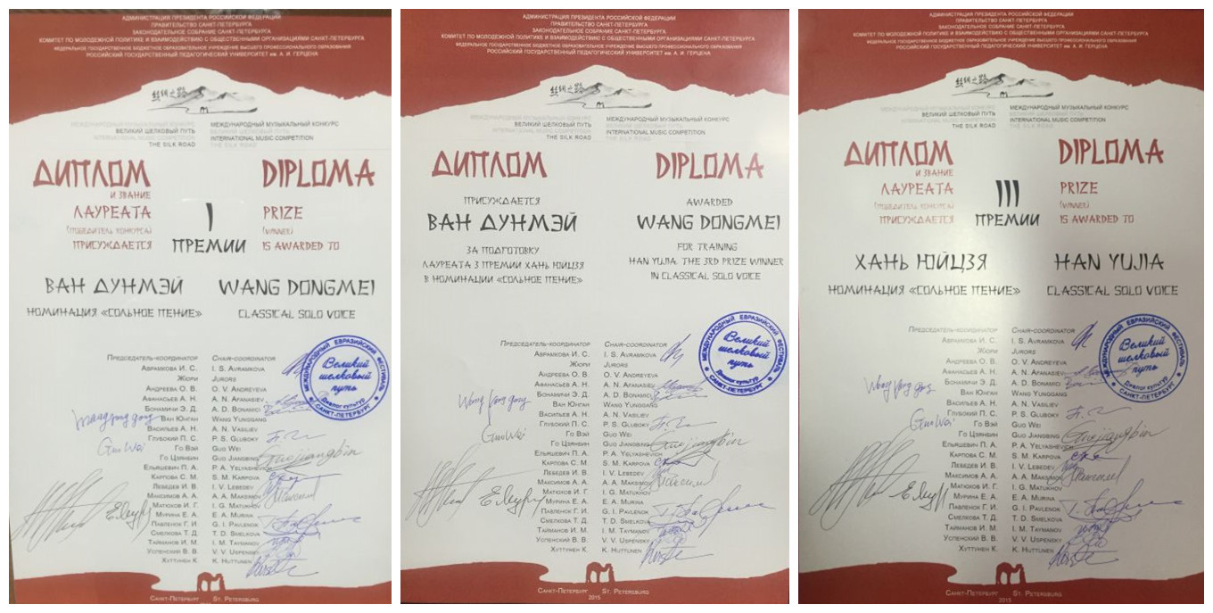 11月15日至22日,由中俄两国共同举办的“丝绸之路”欧亚国际艺术节在俄罗斯圣彼得堡市举行。艺术节由国际音乐比赛、民族音乐交流、古典及民族音乐会表演等组成。永利23411集团声乐歌剧系教师王冬梅在国际音乐比赛中获得博士及教师组一等奖、指导教师奖,研究生韩雨佳、杨钰琳分别获得研究生组三等奖及参与奖。