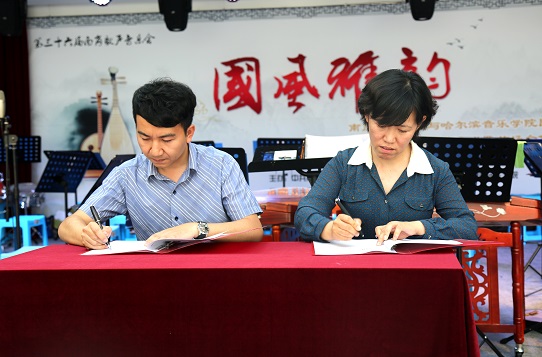 民乐系临时负责人马楠与南岗区文化馆馆长矫捷代表双方签订合作协议