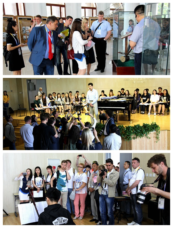 记者团先后参观了学院图书馆、音乐博物馆、音乐厅、主楼、西实训楼、专家公寓等实体建筑,走访了演奏厅、民乐排练室等教学场所,听取了哈尔滨音乐文化历史的讲解,观摩了俄罗斯教师的合唱指挥课及中国教师的民乐演奏课,采访了俄罗斯外教弗拉基米尔,了解了俄罗斯教师在校的教学、生活情况等。