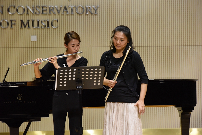 授课中,徐老师首先针对学生基本的节奏与音准在演奏中的重要性以及常见问题进行了细致讲解,同时指出在乐曲演奏中,先做到纵向把每个音符演奏清楚,然后再平行推进,使乐句连贯起来;随后,徐老师示范并教授了学生一些改正错误习惯的练习方法。徐老师在课程中使用很多活泼生动的例子,使授课氛围轻松愉悦,台上台下学生受益良多。
