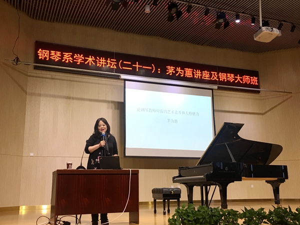 在大师课中,茅老师用其形象而又丰富的语言讲授,使大家明白莫扎特奏鸣曲是充满阳光很歌唱的,哀愁贯穿着贝多芬的曲中是有推进的,传出去的声音还是要回来的。最后她演奏了《阿根廷舞曲》(吉纳斯特拉)赢得现场观众热烈的欢呼声。