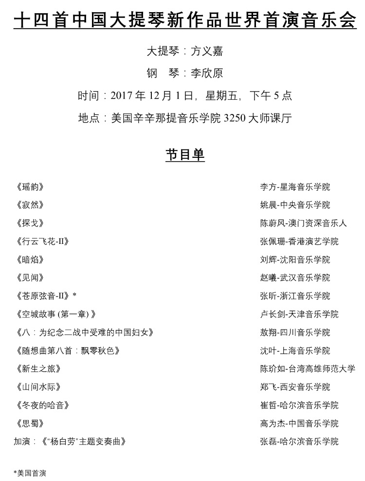 据悉,十四首中国大提琴新作品世界首演音乐会由辛辛那提大学音乐学院大提琴教授William Grubb博士,美国大提琴独奏家Yehuda Hanani,辛辛那提大学音乐学院前院长、作曲系教授Douglas Knehans博士共同策划。