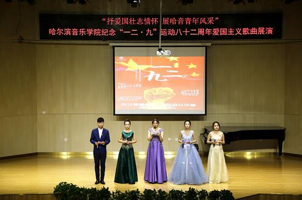 比赛前,学生进行“抒爱国壮志豪情 展哈音青年风采”爱国主义歌曲展演,在对不同时期红色革命歌曲与爱国主义歌曲倾情演绎中,回顾历史,展现伟大祖国日新月异的变化与强大崛起,唤起学子砥砺奋进的激情与干劲决心。