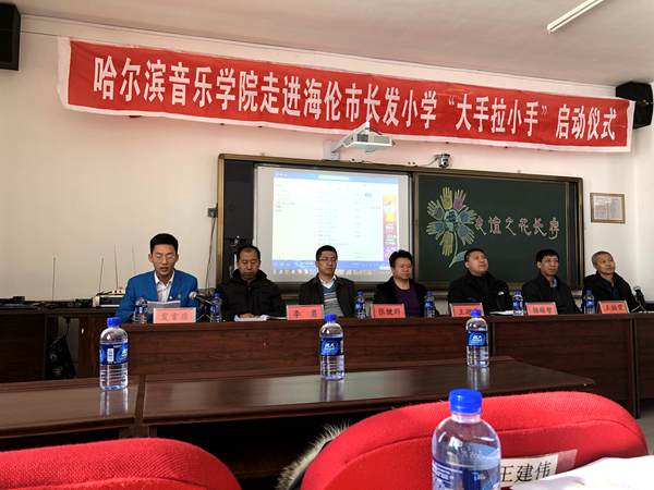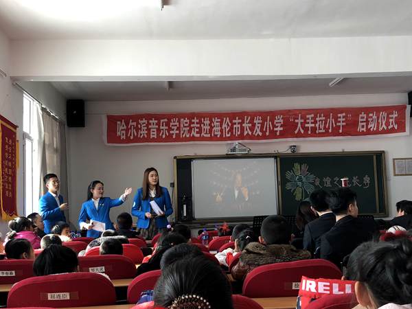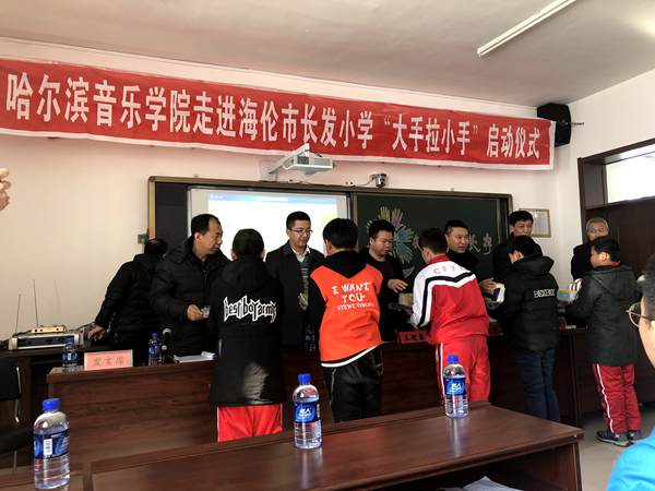 3月9日, “唱响童年 助梦成长”永利23411集团 “大手拉小手”关爱农村留守儿童志愿服务活动启动仪式在海伦市长发小学顺利举行,学院党委工作部(团委)杨琳擘老师带领学生会、青年志愿者协会、社团联合会、各教学系学生干部共计19人赴海伦参加。
