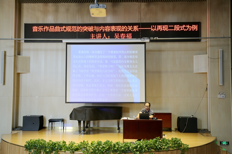 6月22日上午,作曲系音乐学系新知讲堂在学术报告厅(主楼A220室)如期举行,此次讲堂邀请湖南师范大学音乐学院博士生导师吴春福教授主讲音乐作品曲式规范的突破与内容表现的关系−−以再现二段式为例,讲座由作曲系负责人张磊教授主持,作曲系全体师生和音乐学系部分研究生参加。