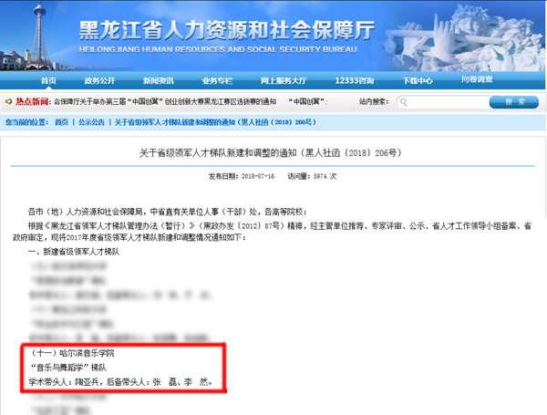 近日,黑龙江省人力资源和社会保障厅公布了2017年度省级领军人才新建梯队。经主管单位推荐、专家评审、公示、省人才工作领导小组备案、省政府审定,我院由陶亚兵副院长作为学术带头人,张磊教授、李然教授作为后备带头人的“音乐与舞蹈学”梯队获批省级领军人才新建梯队。