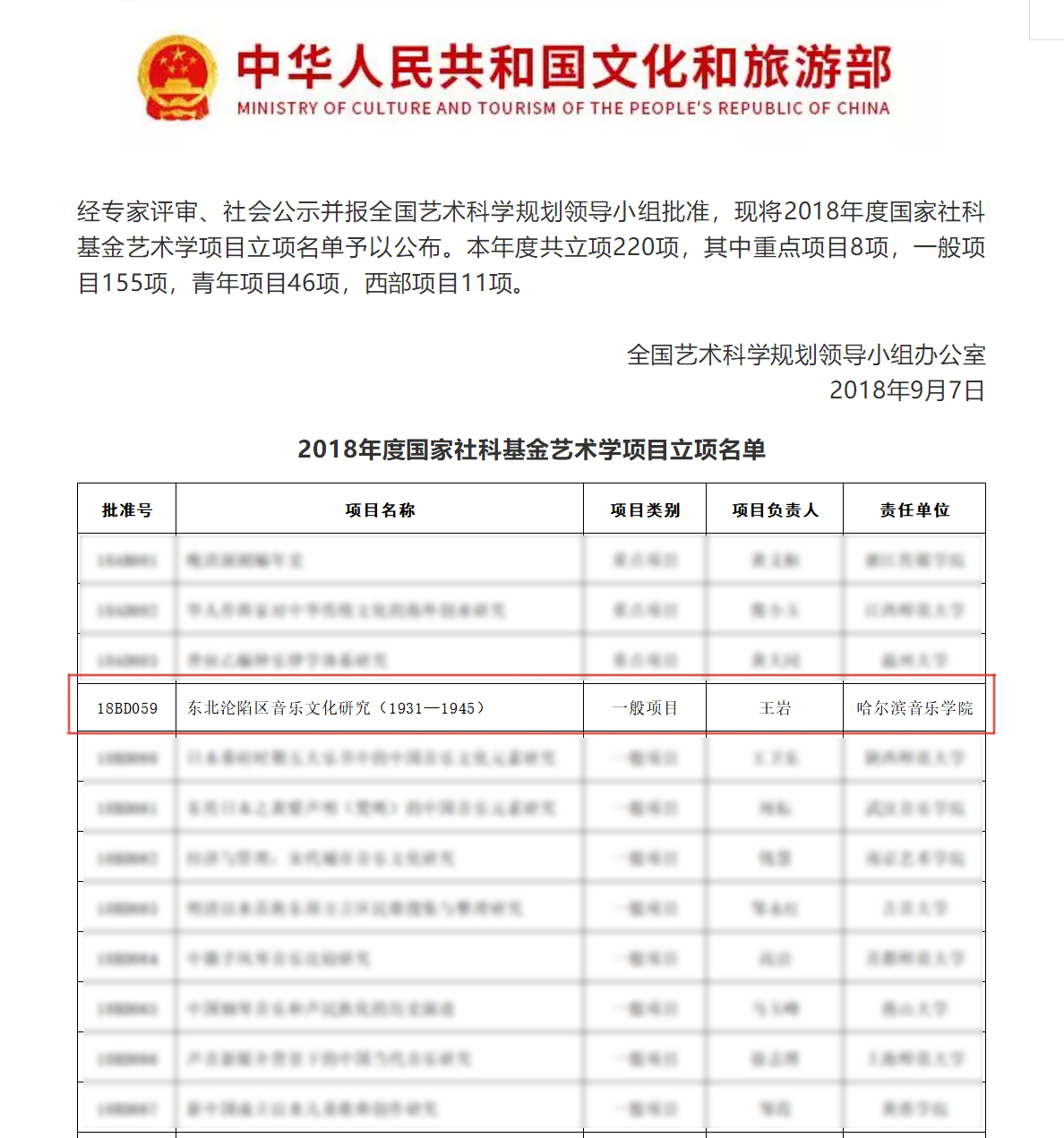 日前,我院音乐学系教授、博士生导师王岩申报的选题《东北沦陷区音乐文化研究1931-1945》获批2018年度国家社科基金艺术学一般项目。