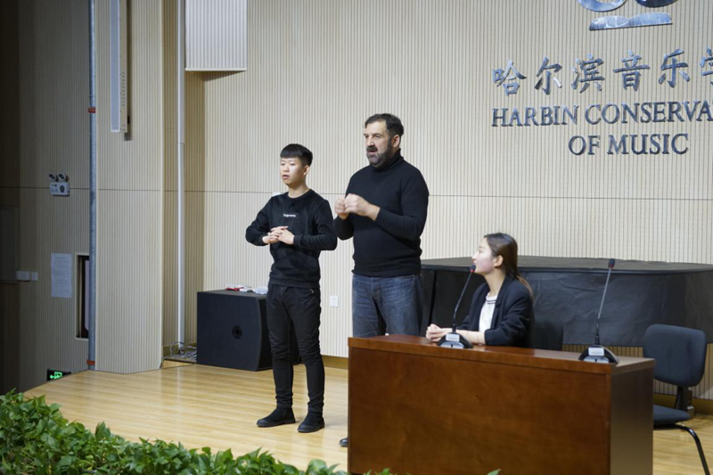 讲座中,尼古拉耶夫斯基·巴维尔·亚历山大首先为学生们讲解了专业演奏者的呼吸方式及其训练方法,详细分析了人的呼吸及参与呼吸的肌肉群,并现场亲自示范了三种呼吸方式。他特别强调普通人的呼吸方式与专业演奏者呼吸方式的区别,并指出不正确的呼吸方式将导致的不良后果。在专业演奏者的呼吸训练环节中,尼古拉耶夫斯基·巴维尔·亚历山大讲授了一组专门的身体训练方法,并与学生张文一起为大家演示。在提问、交流环节中,尼古拉耶夫斯基·巴维尔·亚历山大耐心为学生们解答与演奏气息及姿势相关的问题,讲座现场氛围轻松活跃,在场学生受益匪浅。