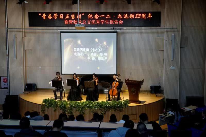 为深入贯彻落实学院“三优”育人的指导思想,表彰在2017-2018年度表现优异,为管弦系做出突出贡献的集体和个人,12月19日下午,“青春学习正当时”纪念一二·九运动83周年暨管弦党总支优秀学生报告会在主楼A220举办。管弦党总支副书记杨玲出席了报告会,管弦系全体教师、辅导员及全体学生参加了报告会,报告会由2017级学生赵博为、刘禹彤共同主持。