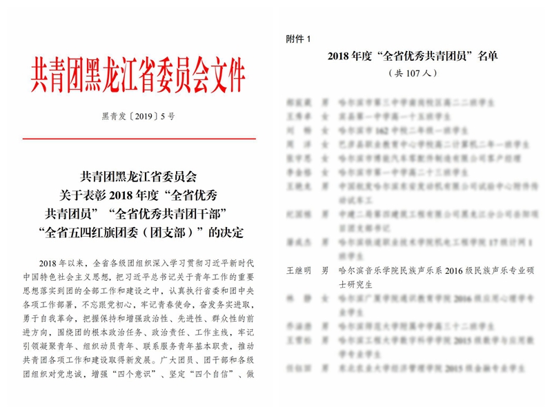 近日,共青团黑龙江省委员会正式下发了《共青团黑龙江省委员会关于表彰2018年度“全省优秀共青团员”“全省优秀共青团干部”“全省五四红旗团委(团支部)”的决定》(黑青发〔2019〕5号),我院民族声乐系2016级研究生王继明荣获黑龙江省2018年度优秀共青团员。
