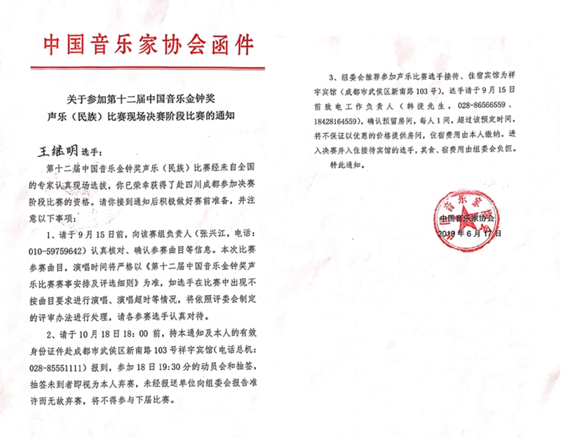 第12届中国音乐金钟奖全国声乐选拔赛于6月14日至17日在山东艺术学院举办。本届比赛首次实行现场选拔,各报送单位共选出432名声乐选手(其中民族组217人,美声组215人)参加本次选拔赛。选拔赛将选出声乐民族组70人、声乐美声组70人与直进选手一同进入10月19日至28日在四川成都举办的决赛。