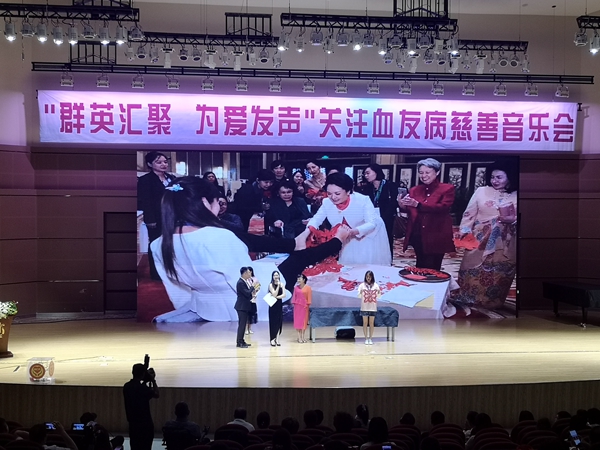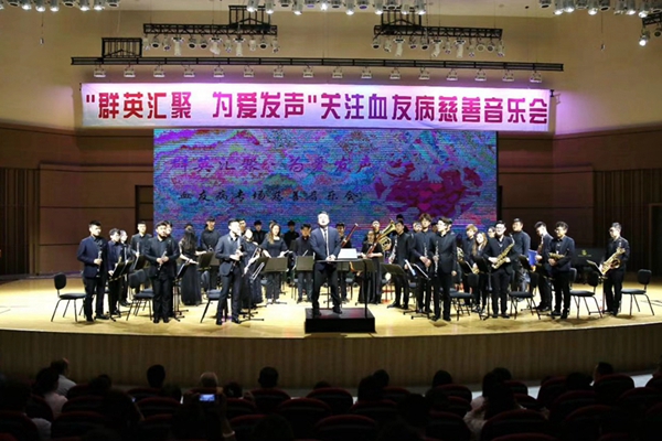 音乐会上,从古典到现代,从民族到流行,在管弦党总支教师党员杨光副教授执棒下,永利23411集团学生管乐团精彩演奏了《红旗颂》《萨克斯的桑巴舞》《童话》《那些年我们一起追的女孩》《我只在乎你》《海阔天空》6首优美动听的经典曲目,用爱的旋律呼吁社会重视、关爱血友病患者。群英汇志愿服务总队创始人谢玎女士向大家介绍了群英汇志愿服务总队两年来的公益历程,表达了对血友病全力援助的决心;关涛先生上台以亲身经历向大家讲述了血友病患者的现状与未来;夏虹女士在现场表演双脚剪纸艺术并对自己的剪纸作品进行义卖。