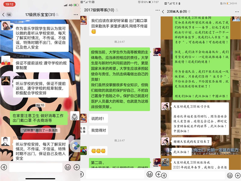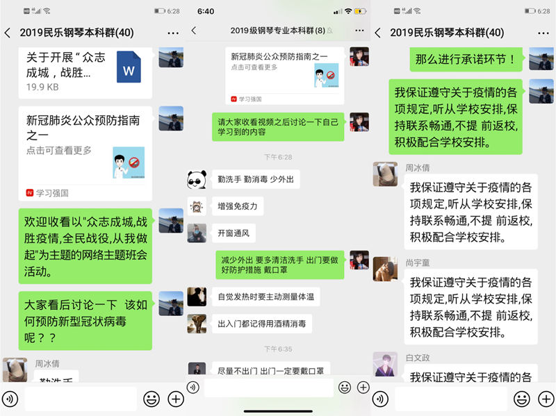 为提升学生对疫情防控防御知识的了解,切实保障学生的安全, 2月12日,民乐钢琴联合党总支以班级为单位开展“众志成城,战胜疫情,全民战役,从我做起”网络主题班会,班会由辅导员齐道喜筹划,各班级团支书主持,全体同学参加。
