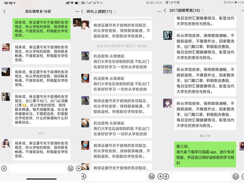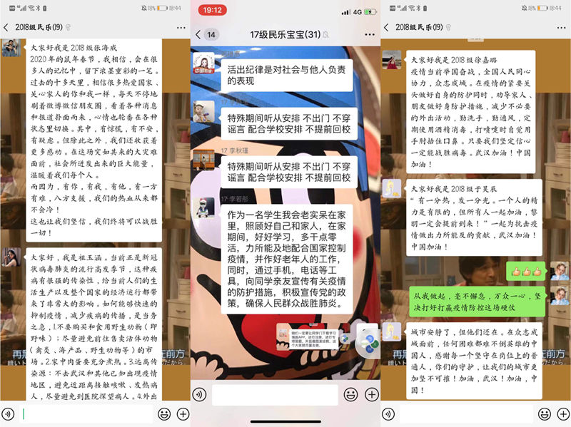 班会上,各班级首先在微信群中通过让学生观看疫情防控知识的视频,从而了解疫情防控知识,随后,同学们在群里进行讨论,如何正确认识疫情以及保护自己和家人,并公开诚诺要:加强防控,服从安排,不提前返校,保持网络畅通,为抗击疫情这场坚硬仗做出一下自己的贡献。最后,齐道喜老师给同学们布置了“宅家任务”,希望同学们充分利用好时间去读一本自己喜欢的书,帮父母分担家务,学习强国APP进行专项答题,巩固自己的专业知识,并做好新学期的学习规划。