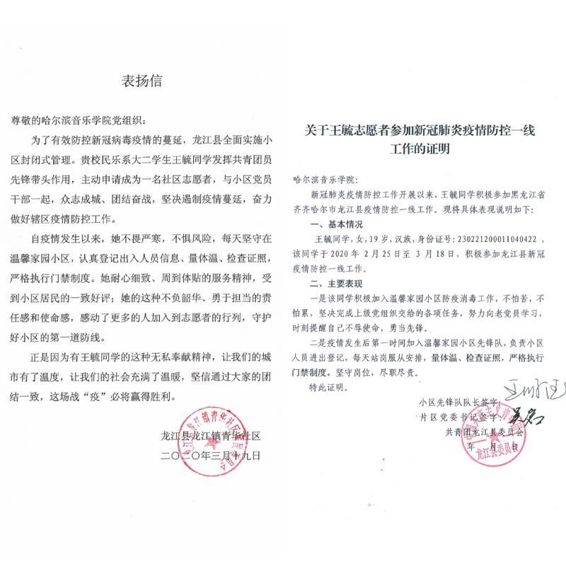在“抗疫”事迹的感召下,学生们通过各种渠道进行了捐款,送去了自己一份祝福。有3名同学根据自身的实际情况参加当地社区的志愿者,为抗疫贡献出自己的力量。其中2018级民乐系本科生王毓工作期间表现优异,收到了当地送来的表扬信。