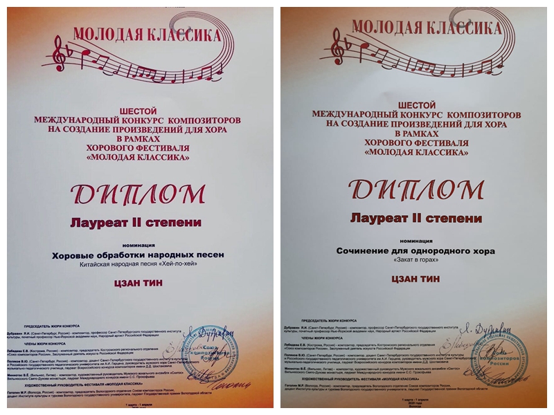 疫情期间,在俄罗斯柴可夫斯基音乐学院访学的我院2018级作曲技术理论专业复调方向博士研究生臧婷,参加了由俄罗斯文化部主办的“青年经典”国际合唱作曲比赛,经过激烈的竞争,其作品在比赛中取得了优异的成绩。参赛的原创作品《夕阳落山》和改编作品《黑喽嘿》分别在项目B和项目D中都获得了最高分,分获两个项目比赛的二等奖(一等奖空缺)。