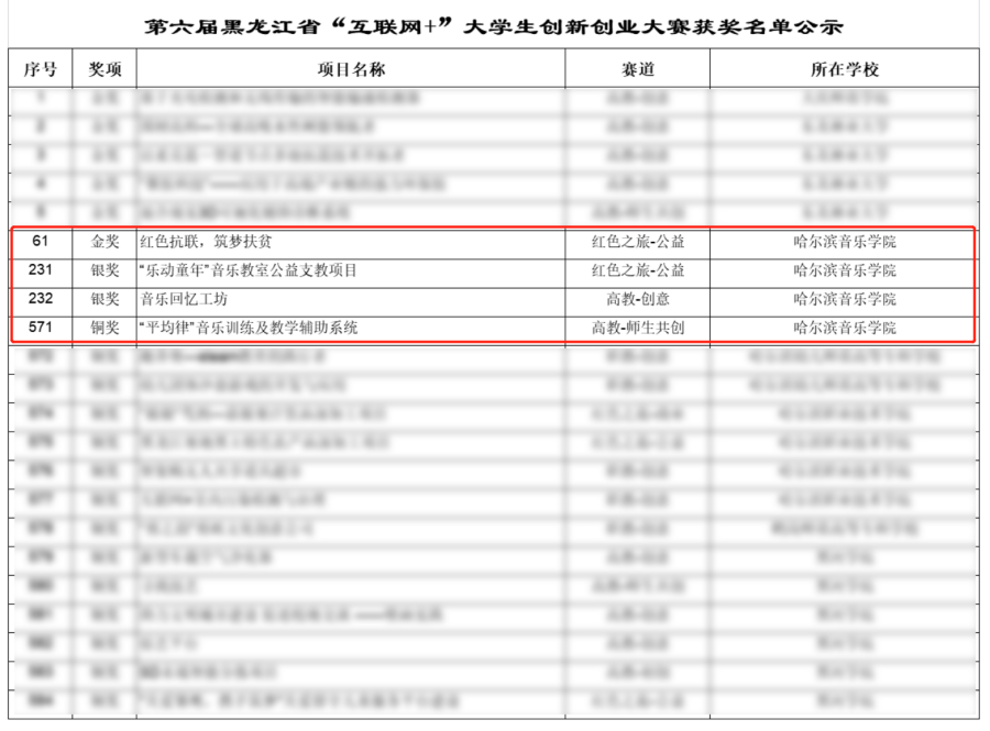 本届赛事自4月开始筹备、6月全面启动以来,虽然受疫情影响,但学院积极组织,持续在云端开展系列培训活动。我院参赛项目《红色抗联,筑梦扶贫》荣获大赛红色之旅赛道−−公益组金奖;《“乐动童年”音乐教室公益支教》荣获大赛红色之旅赛道−—公益组银奖、《音乐回忆工坊》荣获高教主赛道--创意组银奖;《“平均律”音乐训练及教学辅助系统》荣获高教主赛道——师生共创组铜奖;《“快乐的交响乐”——高雅艺术公益推广项目》《太一音乐工作室》等15个项目荣获大赛“闯闯”菁英奖。至此,我院自2018年首次参加“挑战杯”全国大学生课外学术科技作品竞赛,“创青春”全国大学生创新创业计划竞赛,“互联网+”中国大学生创新创业大赛等创新创业竞赛以来,累计荣获“优秀组织奖”1项,“先进个人”称号1项,金奖项目3项,银奖项目8项,铜奖7项,优秀奖15项。获批大学生创新创业训练项目15项。