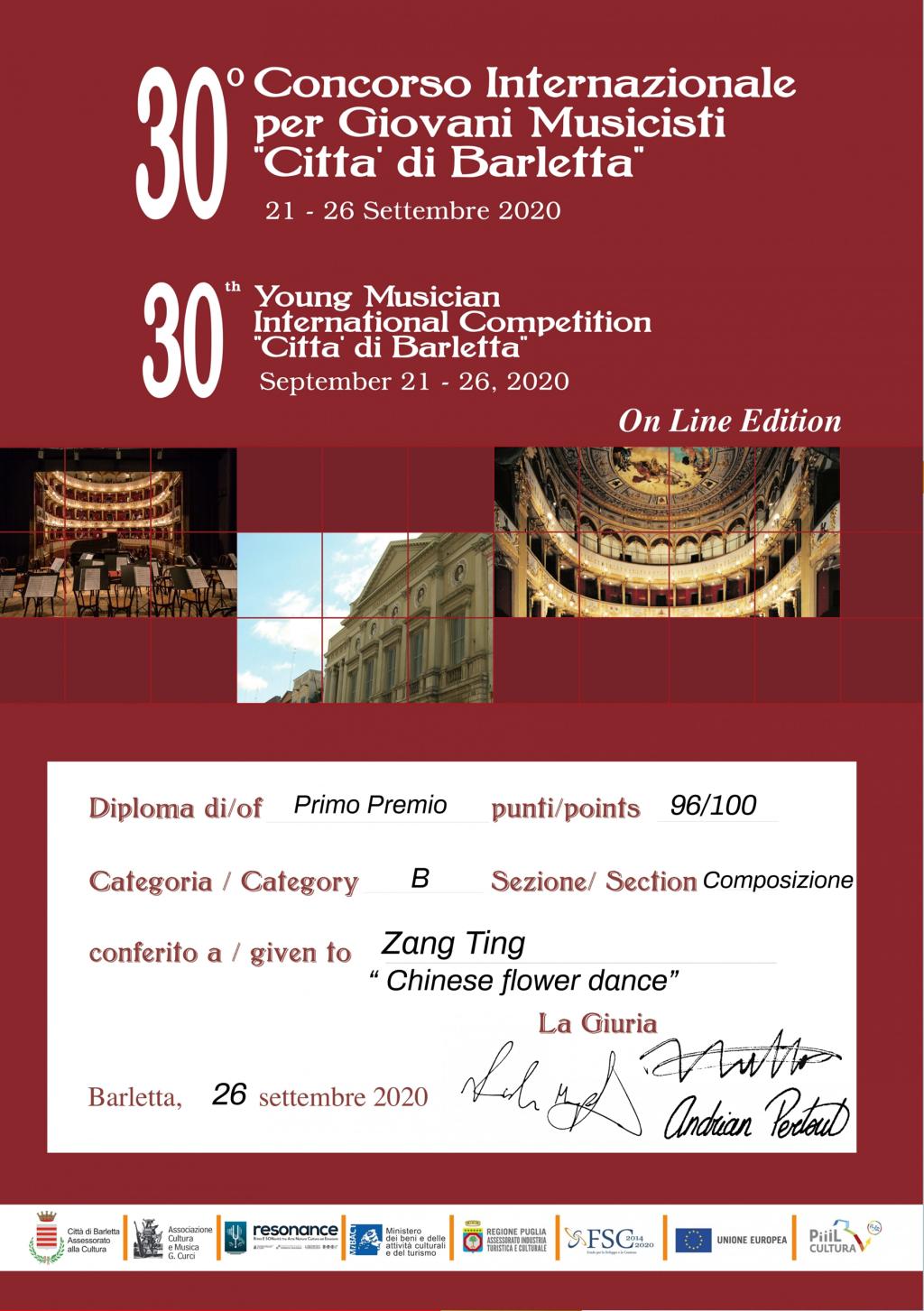 9月21至26日,第三十届意大利巴列塔青年音乐家国际作曲比赛落下帷幕,我院2018级作曲与作曲技术理论复调方向博士研究生臧婷凭借弦乐四重奏《中国花之舞》(chinese flower dance),以96分的高分荣获B组(重奏组)一等奖(primo premio)。获奖作品将被邀请在意大利音乐季演出,其乐谱也将同时出版。
