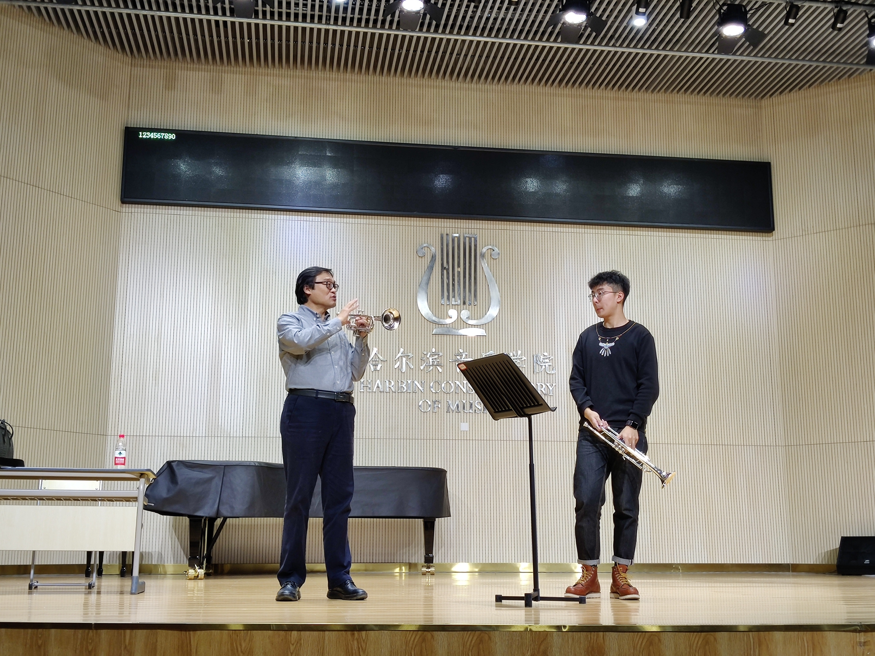 在大师课上,戴中晖对我院管弦系小号专业所有学生进行了授课指导。学生们分别演奏了《海顿♭E大调小号协奏曲》、兴德米特《奏鸣曲》、《辉煌幻想曲》、《 降E大调协奏曲-奈鲁达》等乐曲,戴中晖为每位学生进行了细心的讲解和示范,并根据每位学生存在的问题给予练习建议和改正方法,从乐曲本身讲解了吹奏时的呼吸法和指法,还从全新的视角介绍了乐曲写作的背景,演奏的技巧,音乐性和歌唱性等,参与大师课的师生都感到受益匪浅。