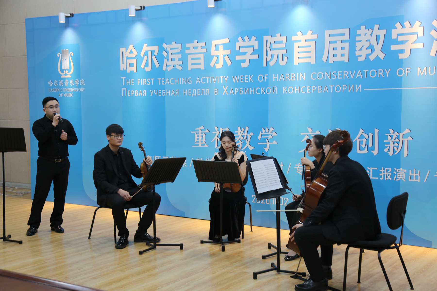 11月9日上午,管弦系在主楼A419举行弦乐公开课。管弦系中提琴教师甄泰然担任主讲人,做了题为《巴洛克与古典时期弦乐作品演奏法》的公开课。