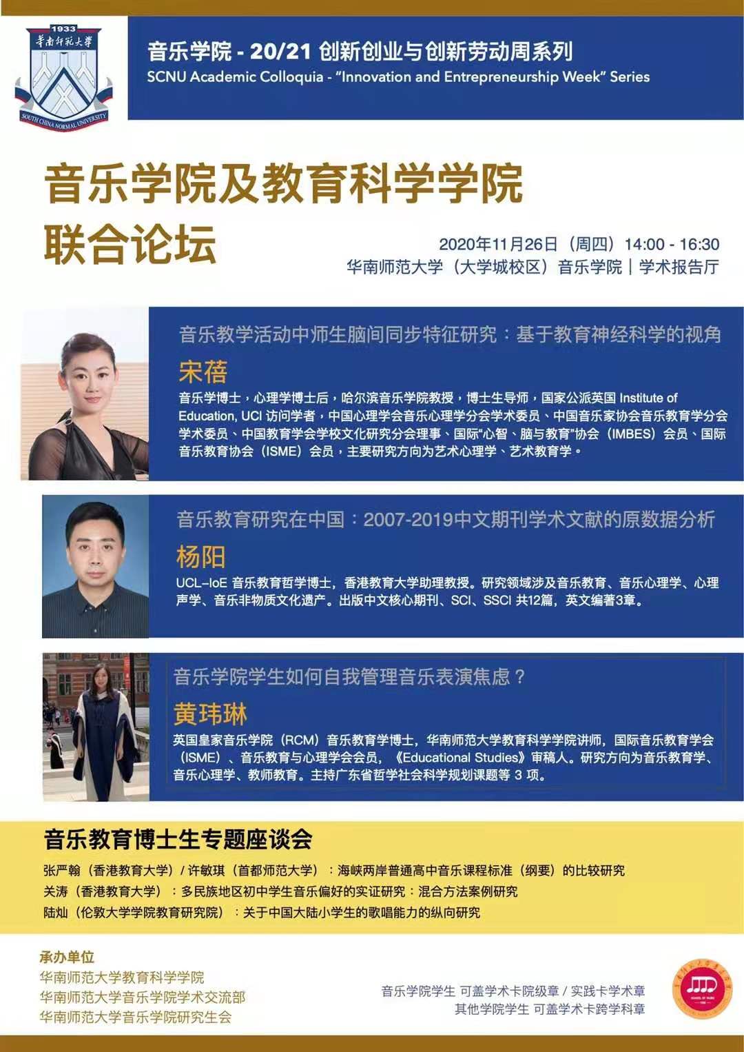 11月26日,我院音乐学系博士生导师宋蓓教授应邀参加华南师范大学音乐学院与教育科学学院联合举办的双创周学术论坛,并做了题为《音乐教学活动中师生脑间互动特征研究》的学术讲座,受到该校师生的热烈欢迎。