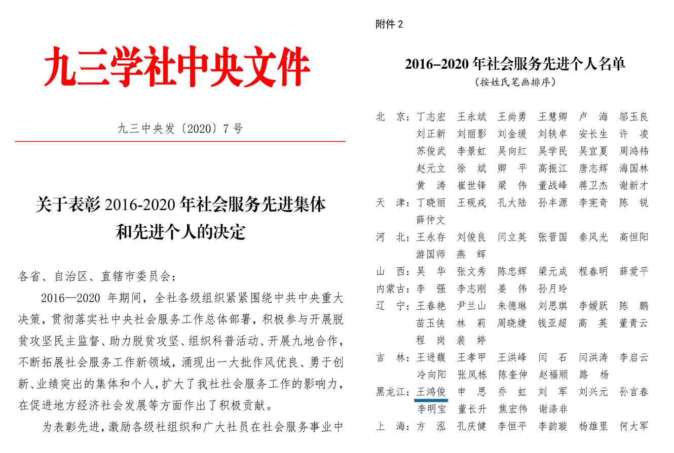 今年下半年,九三学社中央做出决定,表彰2016-2020年社会服务先进集体和先进个人。九三学社哈音支社主委、声乐歌剧系副主任王鸿俊教授荣获“九三学社中央社会服务先进个人”荣誉称号。