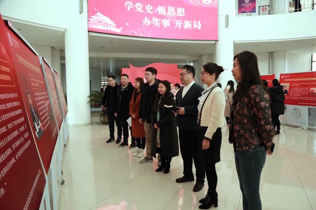 会后,管弦系党总支组织全体参会人员在学院主楼一楼大厅参观了学院“习近平总书记关于党的历史的重要论述”专题展,带领老师们回顾了我党团结带领中国人民不懈奋斗的光辉历程,重温了党为中华民族以及人类社会发展作出的伟大贡献、为解决人类问题提供的中国智慧、中国方案,展望了党和人民事业未来发展的光明前景。