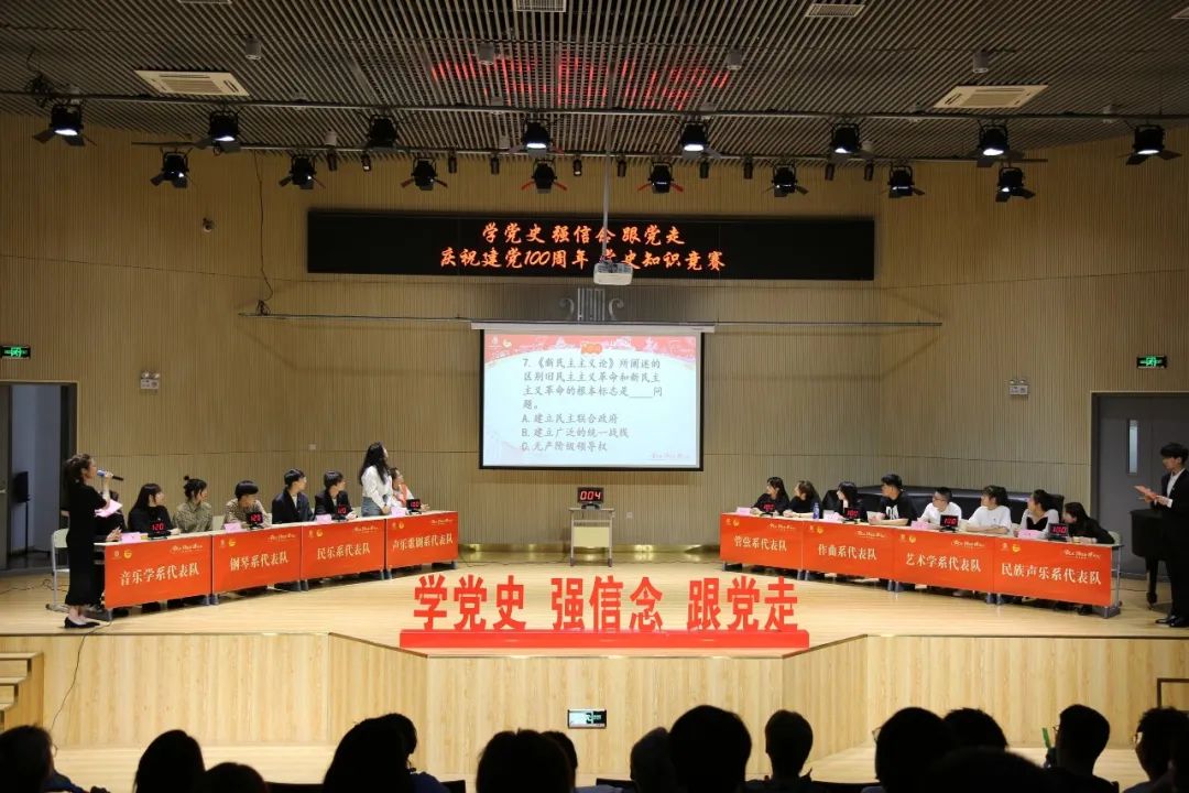 党史知识竞赛由学院党史学习教育领导小组主办,学院团委、院研究生会承办。经各系选拔,共有来自声乐歌剧系、民族声乐系、管弦系、民乐系、钢琴系、音乐学系、作曲系、艺术学系的八支代表队共计16人参加本场比赛。