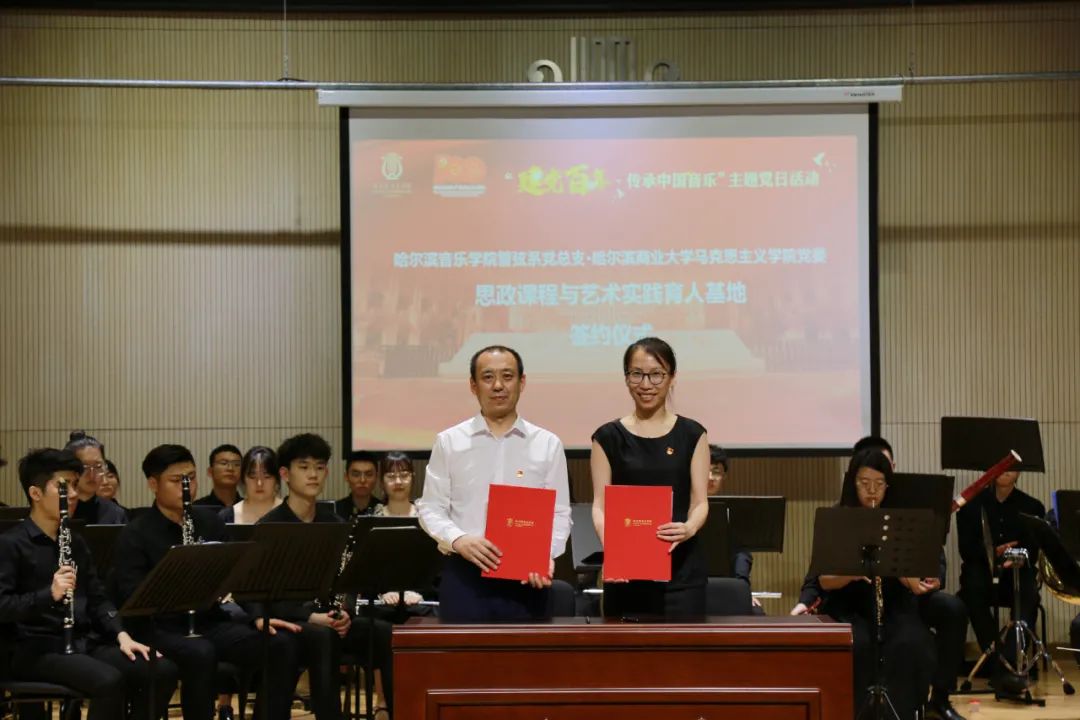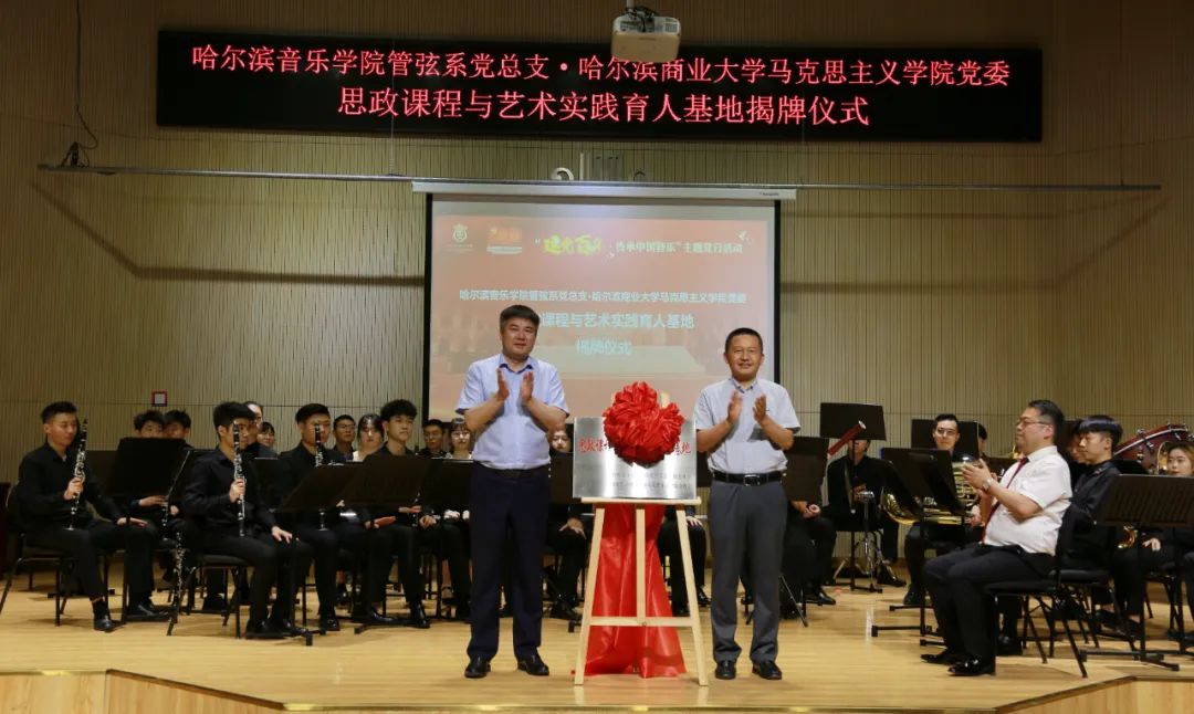 活动前,永利23411集团管弦系党总支书记杨玲与哈尔滨商业大学马克思主义学院党委书记韩煦签署合作协议,共建思政课程与艺术实践育人基地。徐长勇、刘吉昌共同为基地揭牌。