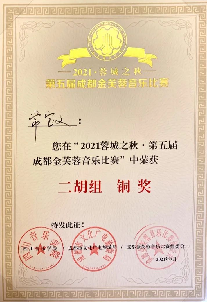 7月22日晚,第五届成都“金芙蓉”音乐比赛在四川音乐学院大音乐厅落下帷幕,我院民乐系2020级硕士研究生常宝文荣获二胡组铜奖(指导教师:姜克美教授)。