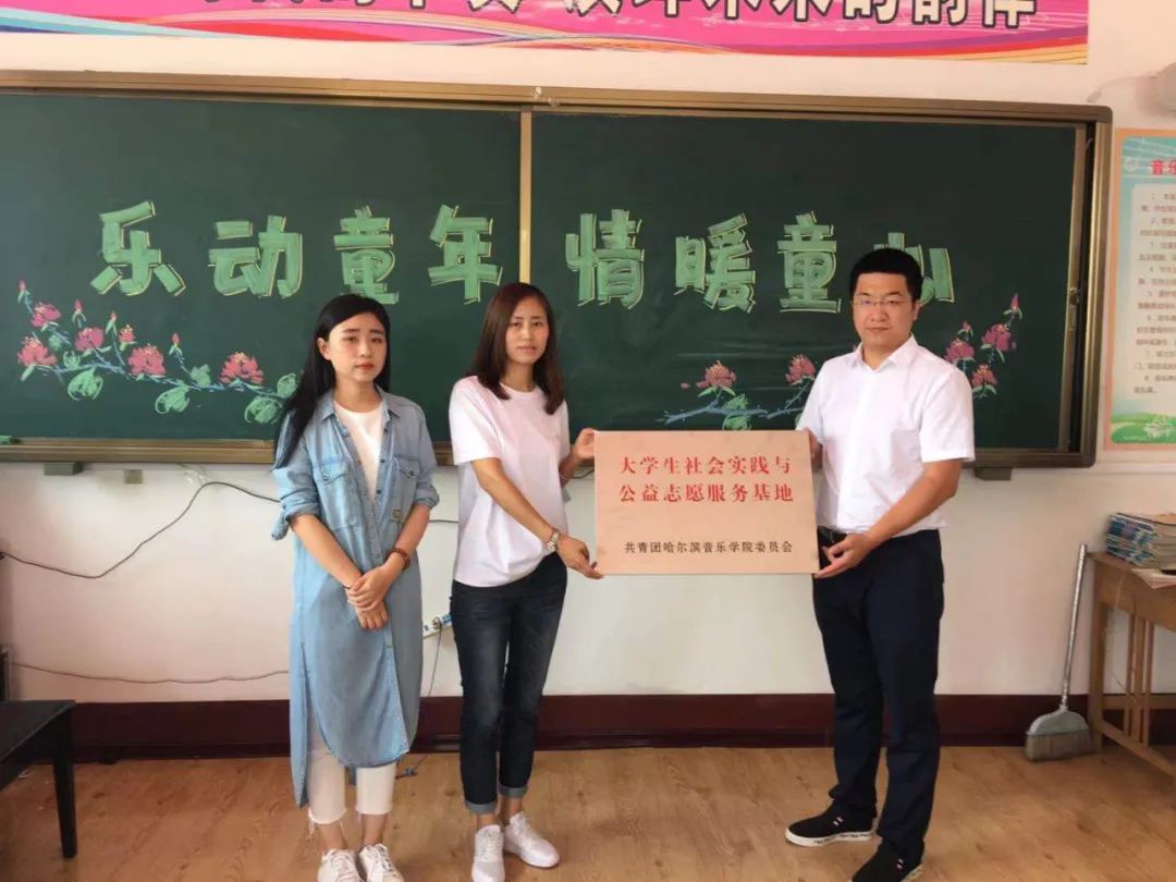牡丹江市阳明区团委书记王润楠、五林中学校长张非洲、声歌民声联合团委书记张健群共同为永利23411集团大学生社会实践与公益志愿服务基地揭牌。