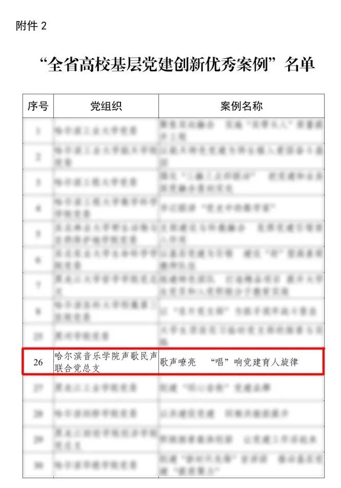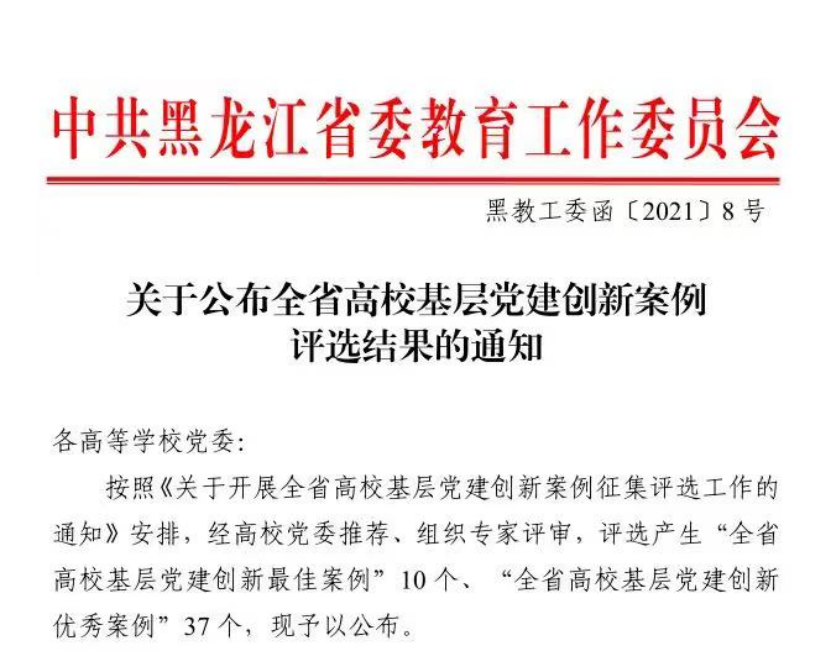 日前,省委教育工委下发了《关于公布全省高校基层党建创新案例评选结果的通知》(黑教工委函〔2021〕8 号)。按照《关于开展全省高校基层党建创新案例征集评选工作的通知》安排,经学院党委推荐、组织专家评审,评选产生了“全省高校基层党建创新优秀案例”37 个。我院党委推荐的声歌民声联合党总支党建案例《歌声嘹亮 “唱”响党建育人旋律》荣获“全省高校基层党建创新优秀案例”,这也是我院首次在全省高校基层党建创新优秀案例评选活动中获得荣誉。