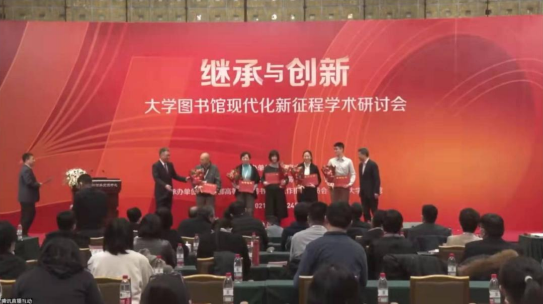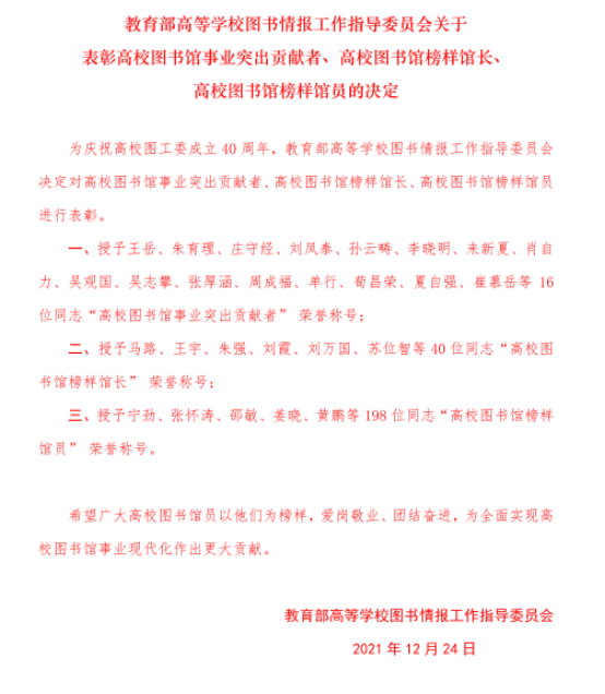 为纪念教育部高等学校图书情报工作指导委员会成立 40 周年,12月24日,教育部高等学校图书情报工作指导委员会在北京大学举办了“继承与创新:大学图书馆现代化新征程”学术研讨会。会议表彰了一批为实现我国高校图书馆现代化而长期爱岗敬业、做出突出贡献的榜样馆员,我院图书馆顾伟泉获得“高校图书馆榜样馆员”荣誉称号。