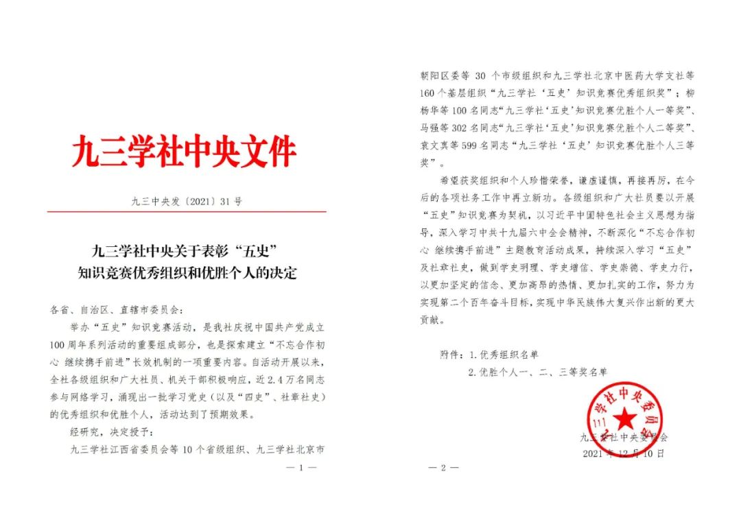 12月13日,九三学社社中央下发《关于开展“五史”知识竞赛并对各级优秀组织与优胜个人予以奖励的决定》文件。举办“五史”知识竞赛活动,是九三学社庆祝中国共产党成立100周年系列活动的重要组成部分,是探索建立“不忘合作初心 ,继续携手前进”主题教育长效机制的重要手段。