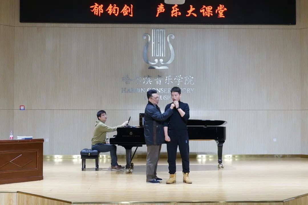 课堂上,郁钧剑讲授了美声唱法、民族唱法的异与同。他指出,民族唱法在借鉴了美声唱法技术的同时,要回归到民族唱法的语言上,就民族唱法中的咬字、语音、语气以及如何进行咽音与喷口练习进行了细致的讲解。