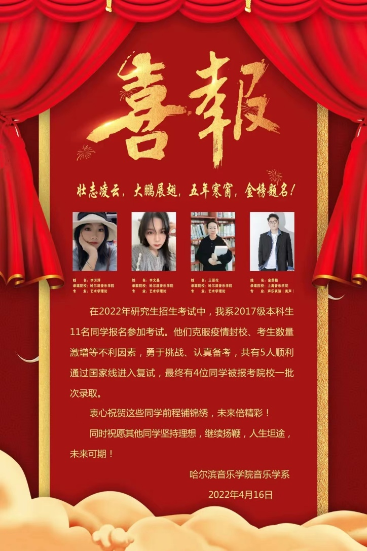 年初以来,音乐学系通过大力倡导优良学风,着力整顿课堂秩序,严格教学考试纪律,严肃学术研究风气,初步营造了优良的学习风气和学习环境,大幅降低了挂科人数,未发生考试违纪现象,大学英语四六级单次通过人数达18人,本科应届毕业年级学生考研上线率达41.7%,4名考研学生被一志愿录取,其中1名还被上海音乐学院声乐表演(美声)方向录取,创近年来最好成绩。
