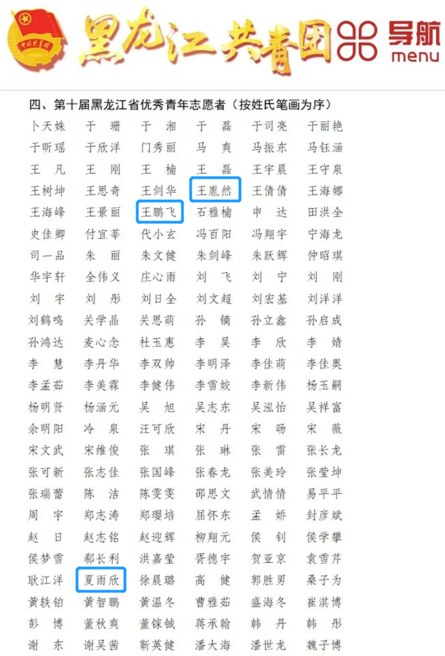 第十届黑龙江省青年志愿者先进集体和个人评选结果揭晓,我院团委干事王胤然、管弦系团委书记王鹏飞、民族声乐系2019级研究生夏雨欣在众多候选人中脱颖而出,荣获第十届“黑龙江省优秀青年志愿者”荣誉称号。