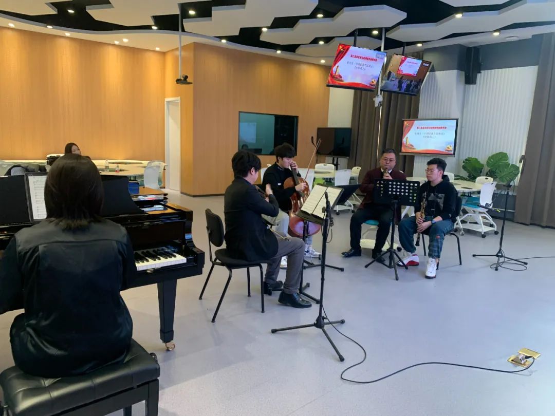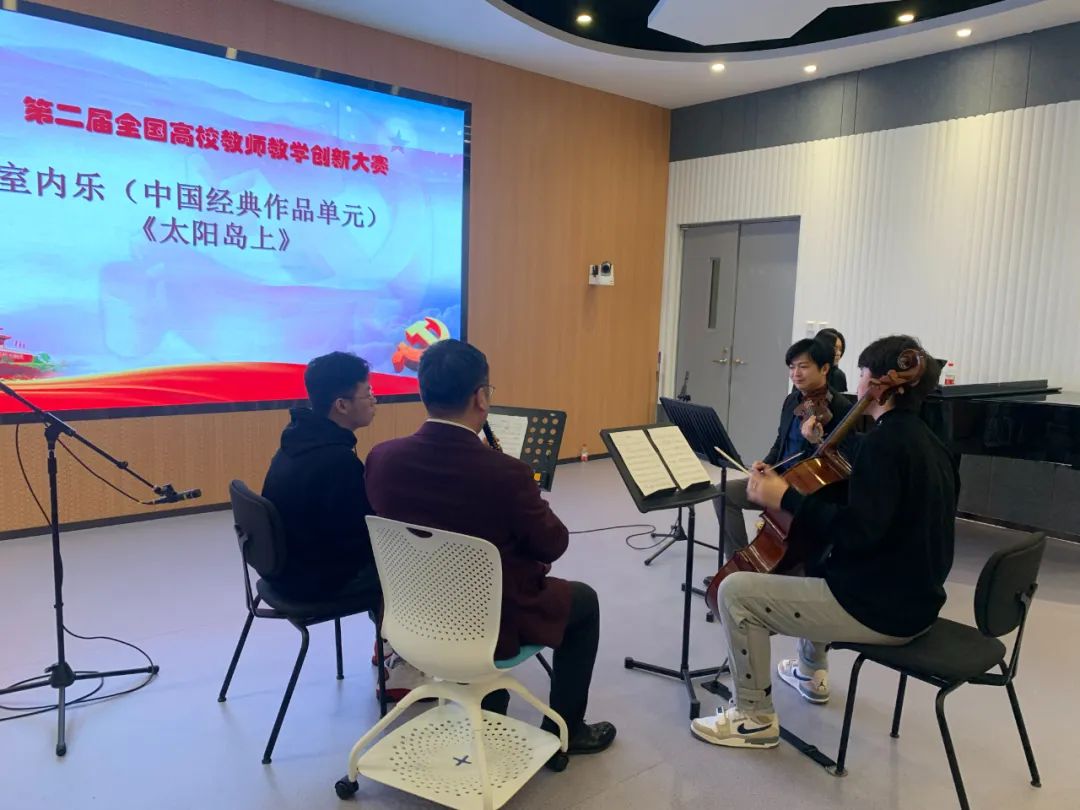 我院于2021年12月组织启动了相关工作,经教学系申报、学院评审,最终选拔4位教师参加省赛。本次比赛采取教学创新设计汇报与课堂教学相结合的方式进行。比赛中,杨光教授带领教学团队以室内乐器乐合奏《太阳岛上》的授课环节参加比赛,在教学设计上充分体现以学生为中心的教育理念,将思政教育融入音乐课程教学,通过“老歌新编”和“老曲新奏”,为乐曲加入新的配器和新的音乐元素,巧妙运用现代信息技术,提炼再创作黑龙江优秀音乐曲目,呈现出良好的教育教学效果。
