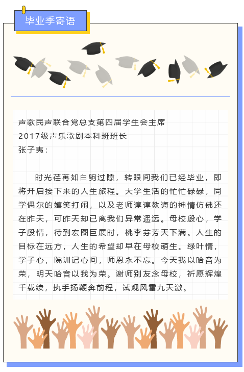 此去鲜衣怒马,热血不改从前;愿此生繁花似锦,归来仍是少年!希望2022届毕业生同学赓续哈音血脉,传承哈音精神,立足新时代的大舞台,在民族复兴的伟大历史进程中,以梦为马、莫负韶华,谱写人生壮丽的新篇章!毕业快乐!祝福你们!