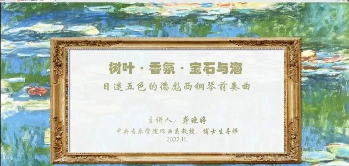 11月16日晚七点,钢琴系“名师微课堂•德彪西专题”第六讲——《树叶·香氛·宝石与海——目迷五色的〈德彪西钢琴前奏曲〉》线上开讲。中央音乐学院作曲系教授、博士生导师龚晓婷担任主讲人,钢琴系全体师生实时观看线上直播,近5000名观众在线上网络平台同步观看。