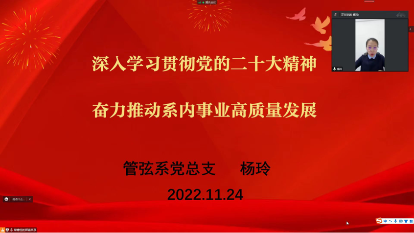 按照学院《学习贯彻党的二十大精神宣讲工作方案》要求,11月24日,管弦系党总支书记杨玲做学习贯彻党的二十大精神主题宣讲,管弦系全体党员师生在线上收听收看。