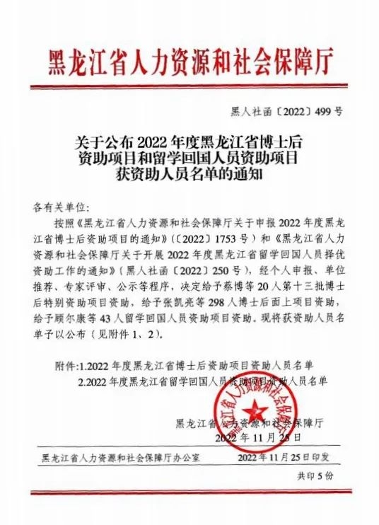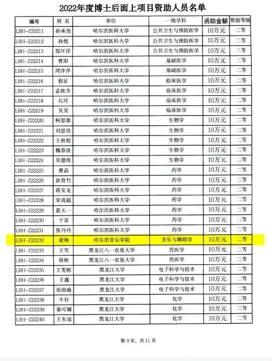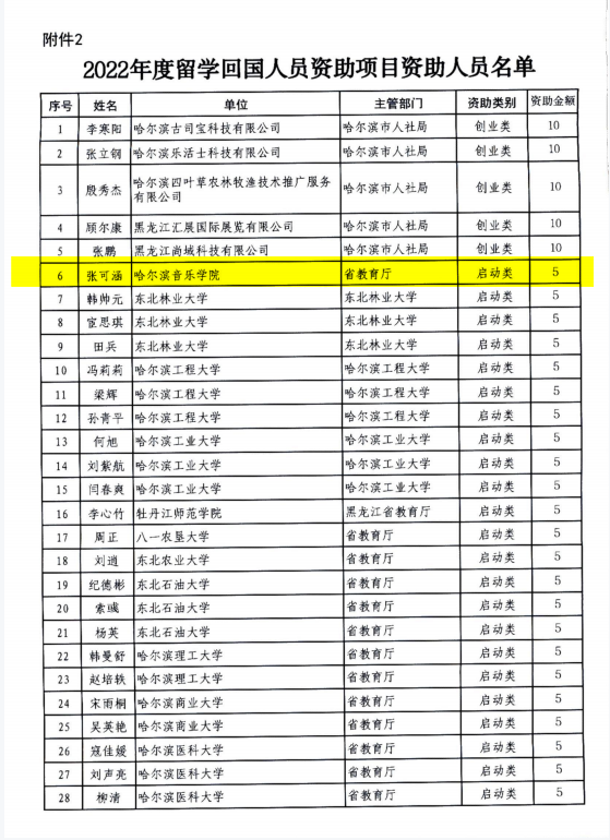近日,黑龙江省人力资源和社会保障厅下发《关于公布2022 年度黑龙江省博士后资助项目和留学回国人员资助项目获资助人员名单的通知》(黑人社函〔2022〕499 号)。我院音乐与舞蹈学博士后梁帅获得2022 年度博士后面上资助项目二等资助,资助金额10万元;管弦系教师张可涵获得2022年度留学回国人员资助项目启动类资助,资助金额5万元。这是我院建立博士后科研流动站以来首次获得资助项目。